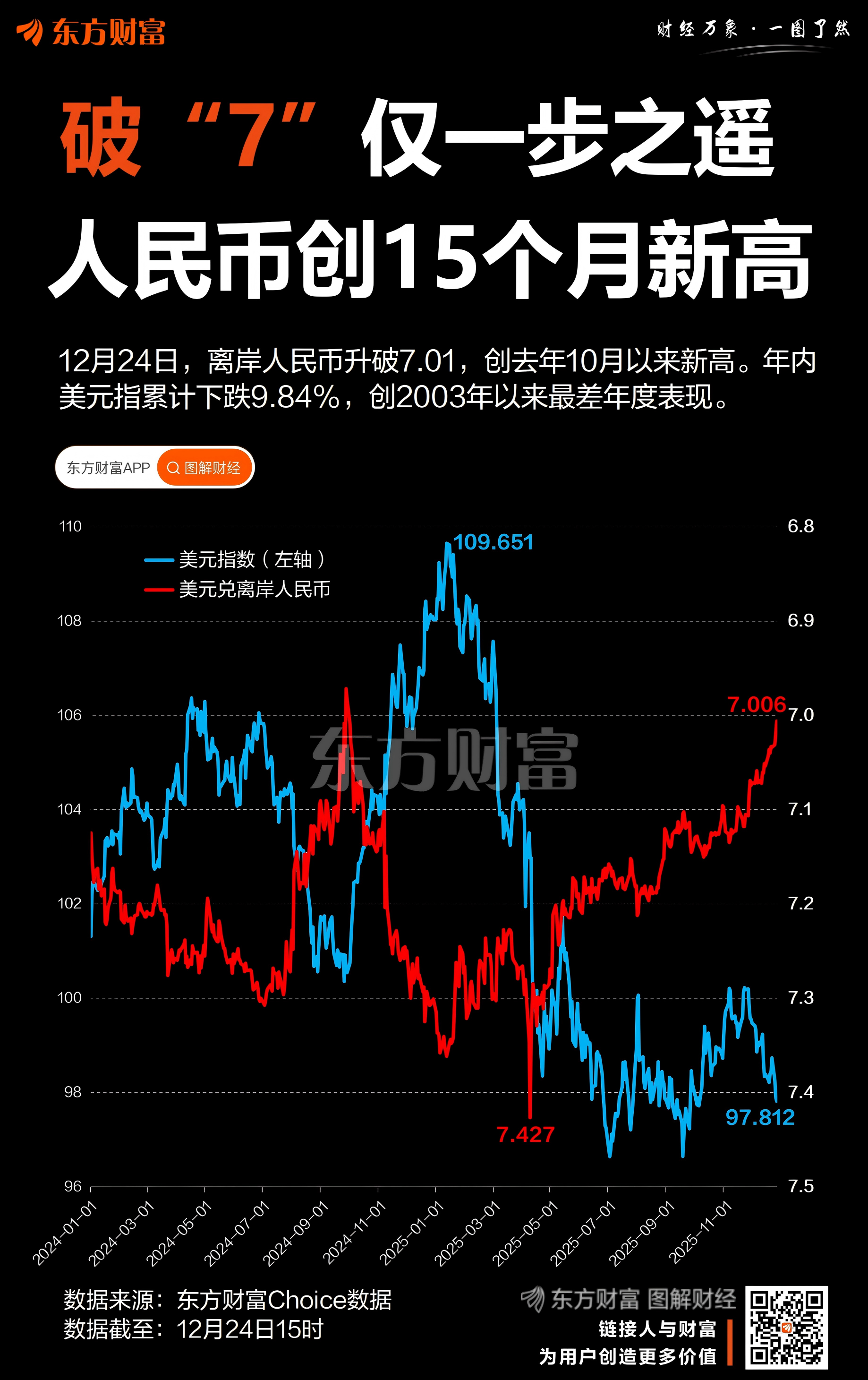 ]article_adlist-->12月24日,离岸人民币兑美元升破7.01元关口,创15个月新高,距离破“7”仅一步之遥。截至北京时间当日15时,美元指数今年已累计下跌9.84%,势创2003年以来最差年度表现,同期离岸人民币兑美元升值4.48%。