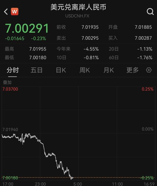 离岸人民币对美元汇率12月24日升破7.01关口,截至发稿最高升至7.0018,距离破“7”关口只有一步之遥,创下2024年10月2日以来的新高。